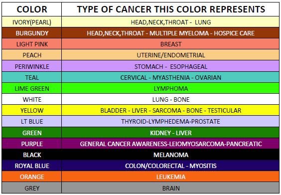 What Color Represents Cancer - Cancer Awareness Ribbon Colors Colors For Other Causes Fact Goods : Green stands for liver cancer, lymphoma, and gall bladder cancer.. The alternate color is listed below the chart. Uncommon or rare cancers may be represented in a few ways—either with a light purple ribbon or a black and white zebra print ribbon. Color makes all the difference when it comes to which cancer you are trying to bring awareness to or trying to raise money for; There are several types of bone cancer. A light purple or lavender ribbon is generally used to represent all cancers as a whole.